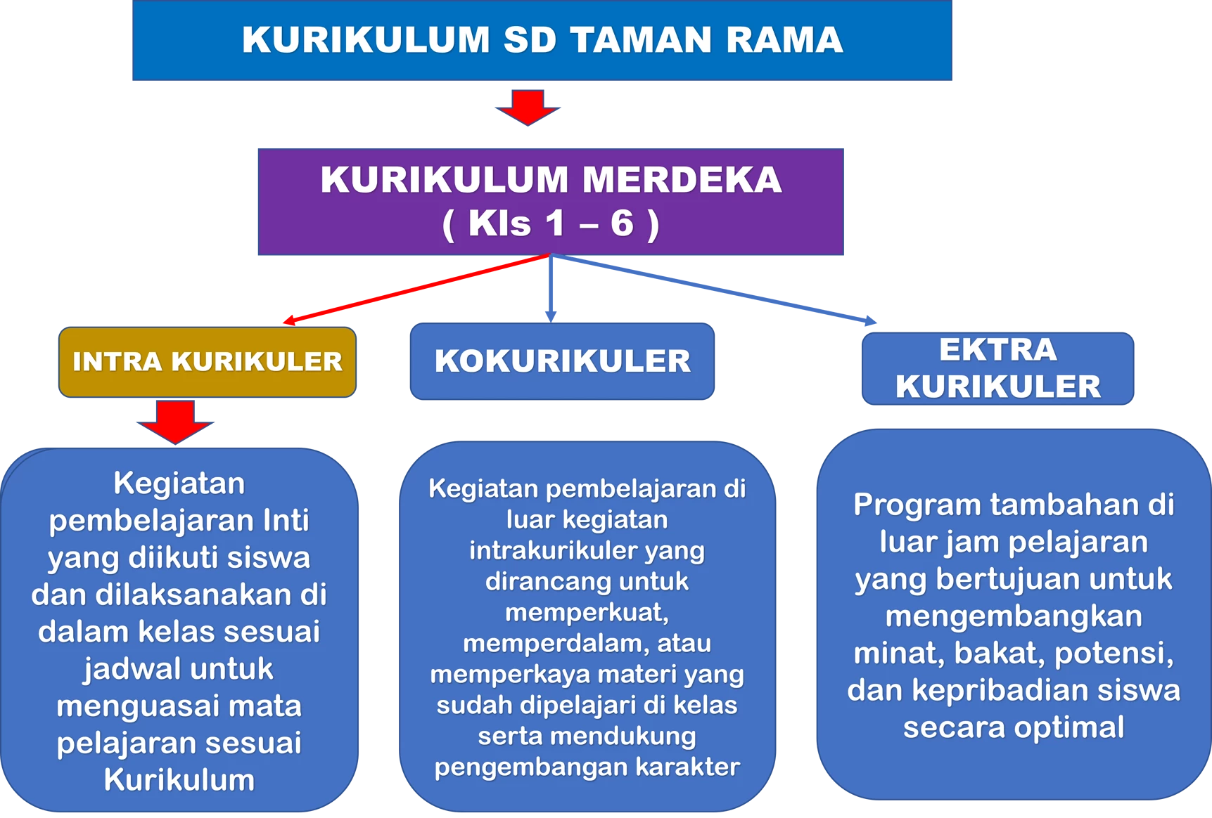 At Primary School (SD) Taman Rama Denpasar, we are proud to implement the National Curriculum, known as the Kurikulum Merdeka, for students in grades 1 to 6. This curriculum is designed to provide a comprehensive educational experience through a balanced combination of intracurricular, co-curricular, and extracurricular activities.